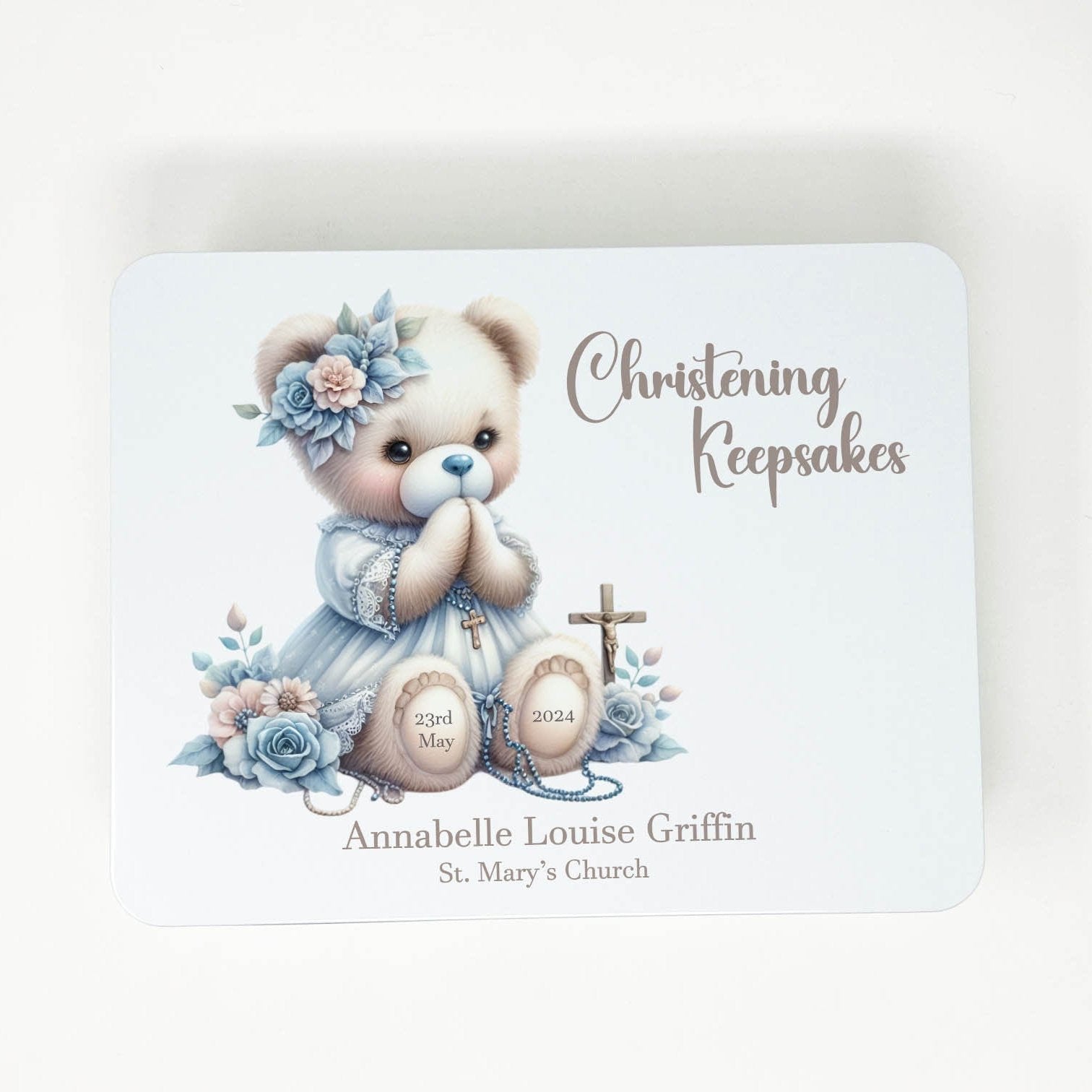 Introducing a beautiful personalised keepsake tin that can be used for storing memories and trinkets from a Christening, Baptism, or Naming Ceremony.