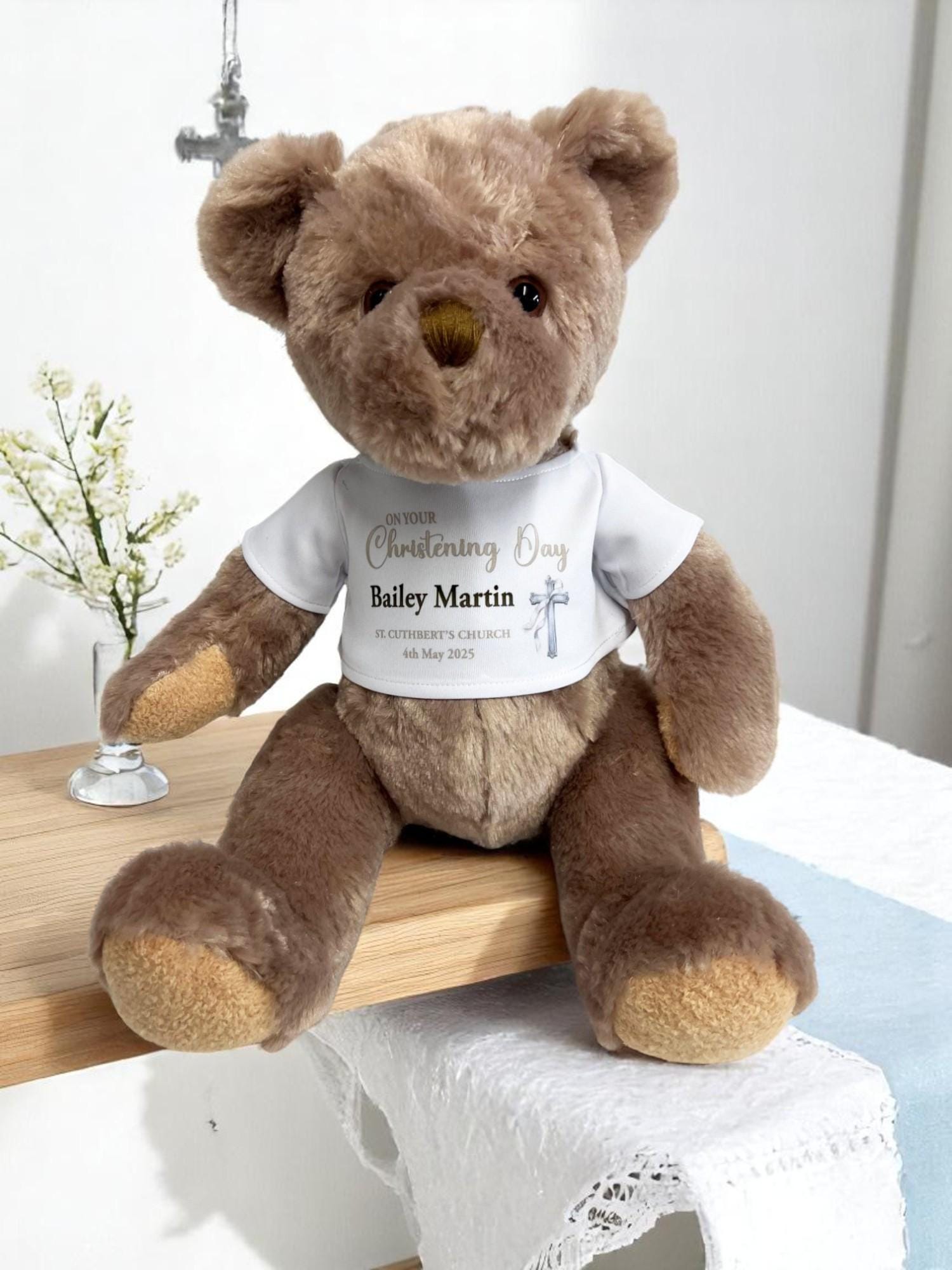 This delightful soft teddy bear is an excellent gift choice for a Christening, Baptism, or Naming Day. You have the opportunity to customise the wording to perfectly match the occasion and personalise it with a name, location, and date of the ceremony, making it even more special.