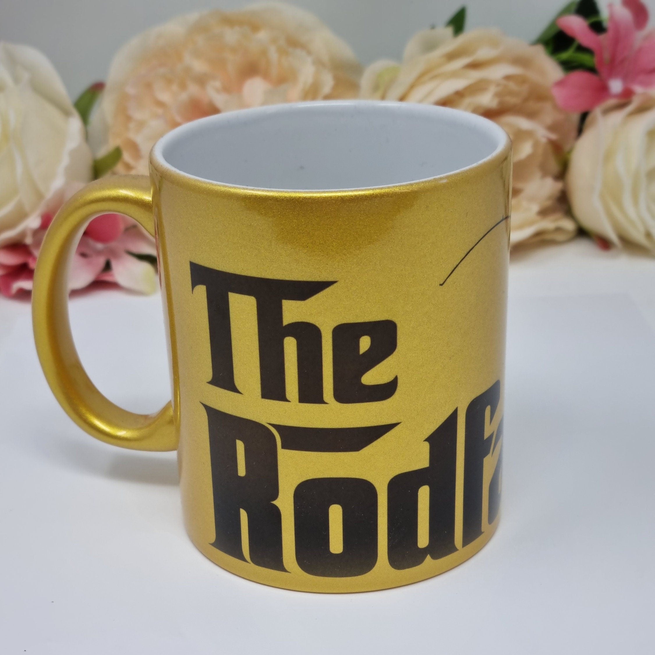 This mug is all gold with printed black writing and features a silhouette fisherman and his rod