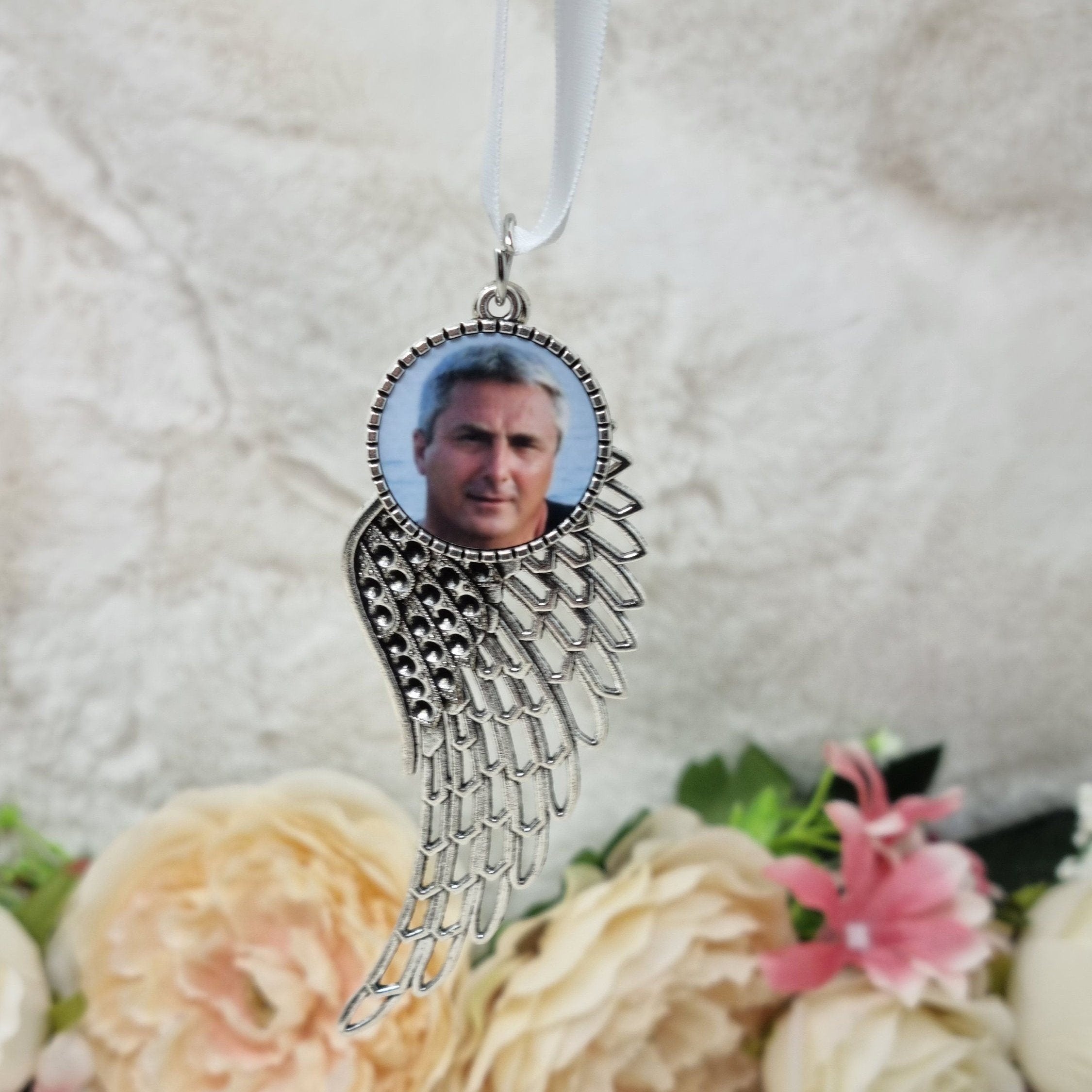 The wing measures approximately 10cm in length and 3.5cm in width. It will feature an image of your loved one, with the size of the disc being about 2.7cm. The item is made from Zinc Alloy.