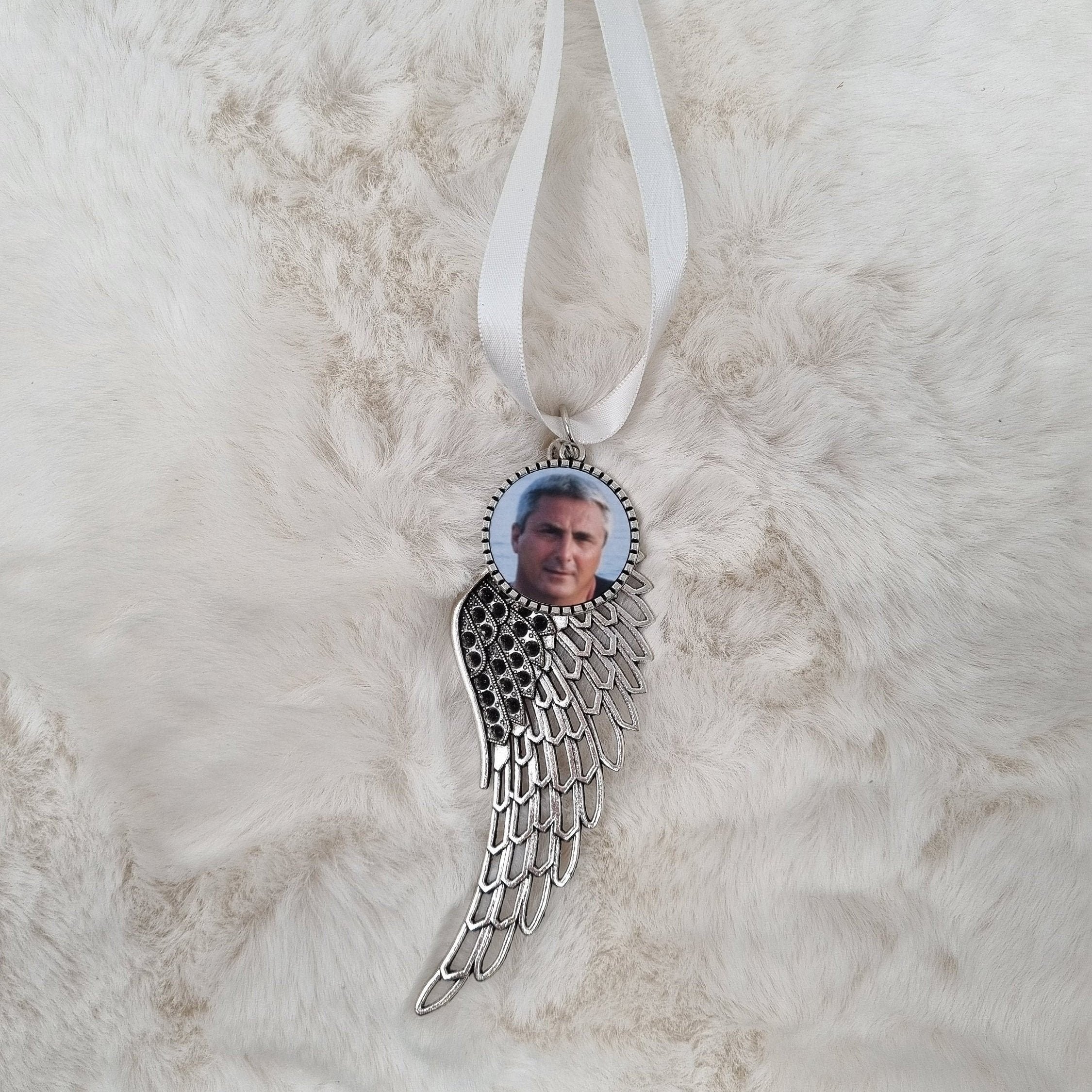 This single angel wing with a hanging ribbon is a beautiful way to commemorate a loved one. You can hang it around the home, in a car, use it on your keys, or hang it on your Christmas tree.