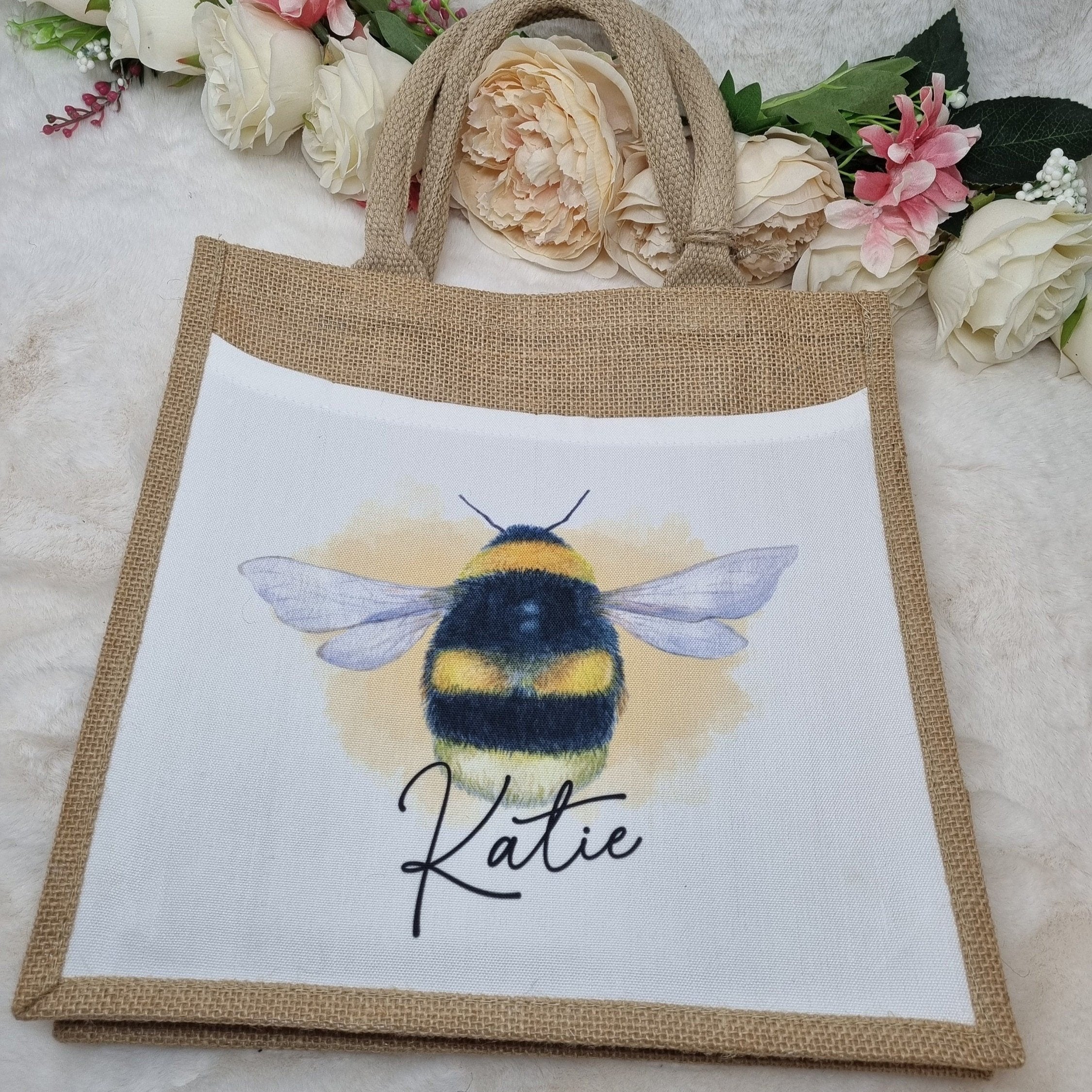 These detailed bumble bee jute bags provide a unique and convenient way to carry a range of items like lunch, books, shopping or even to store knitting or craft items.