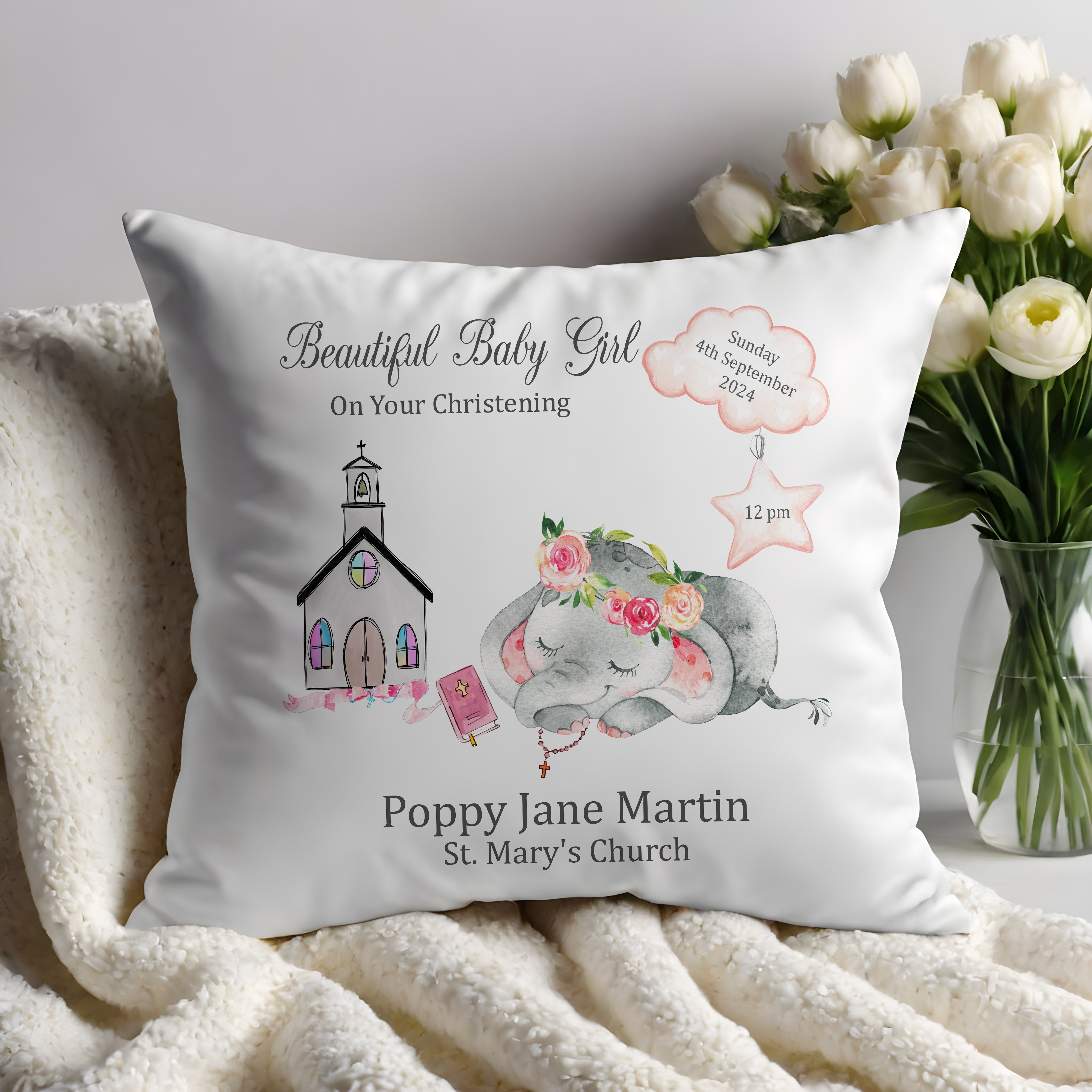 This adorable elephant cushion would be a lovely gift for a baby boy or girl on their christening or baptism. It is available in two designs, for either a boy or a girl.