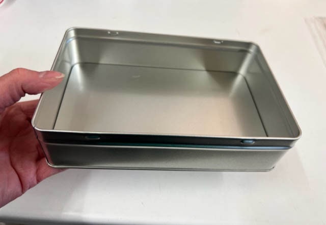 The tin measures 18cm x 11cm & is 5cm deep with a removable lid