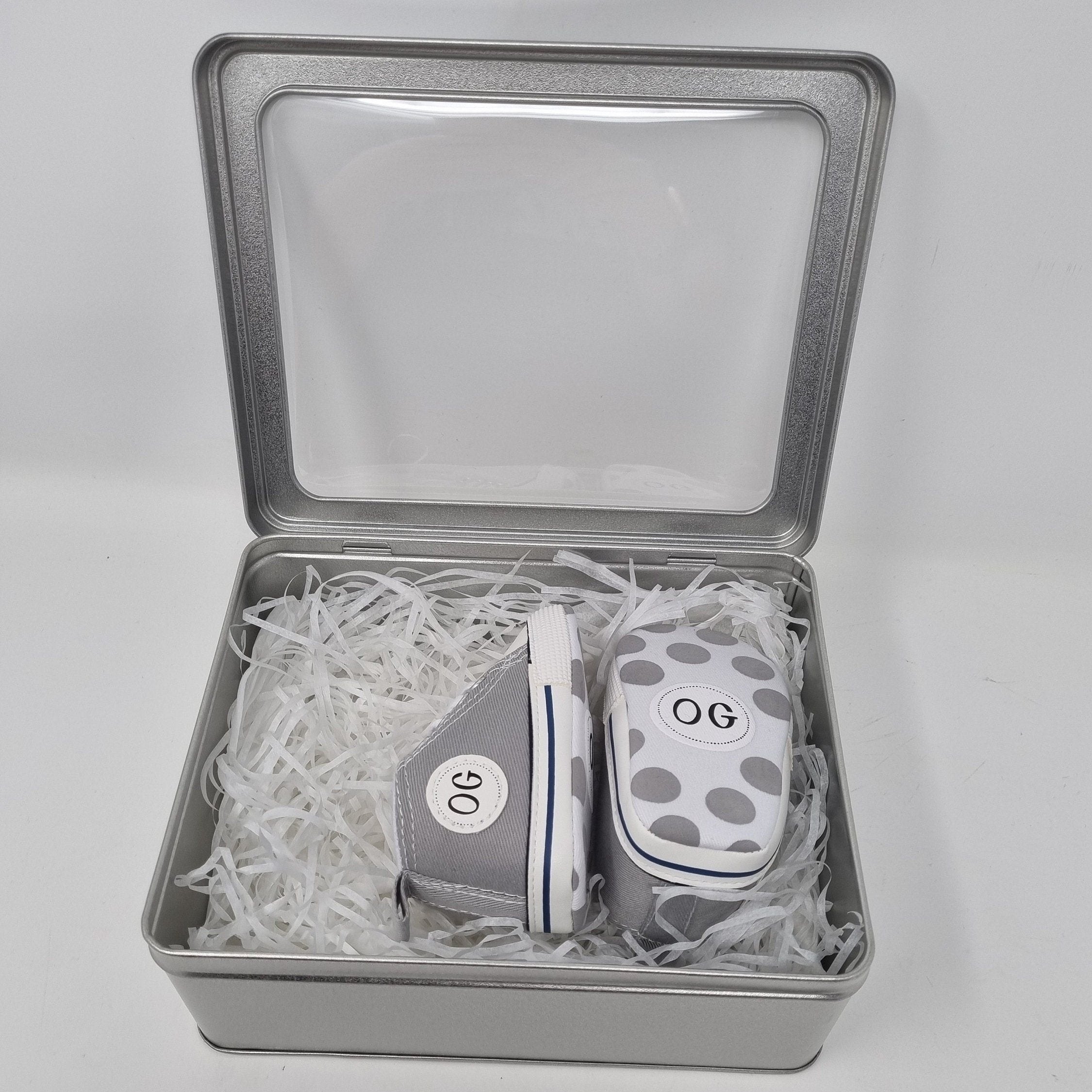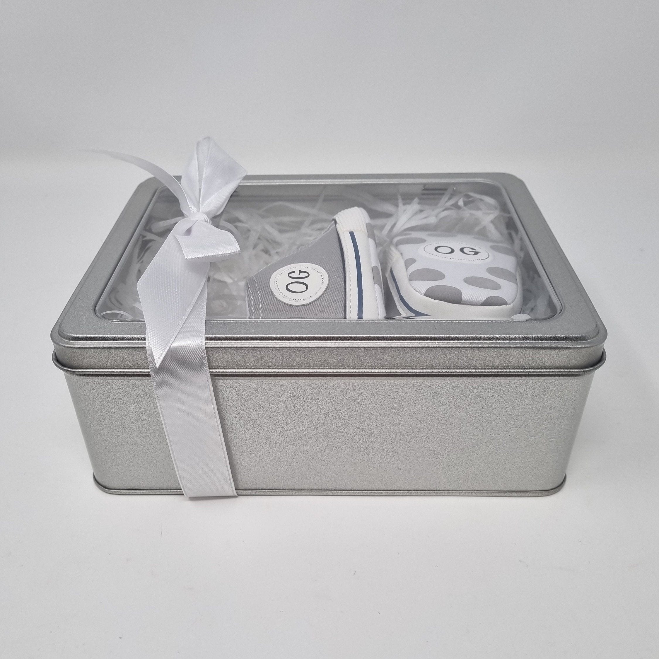 The booties come presented in a metal tin with a clear window, shredded paper, and a bow, making them a lovely gift for a newborn baby.