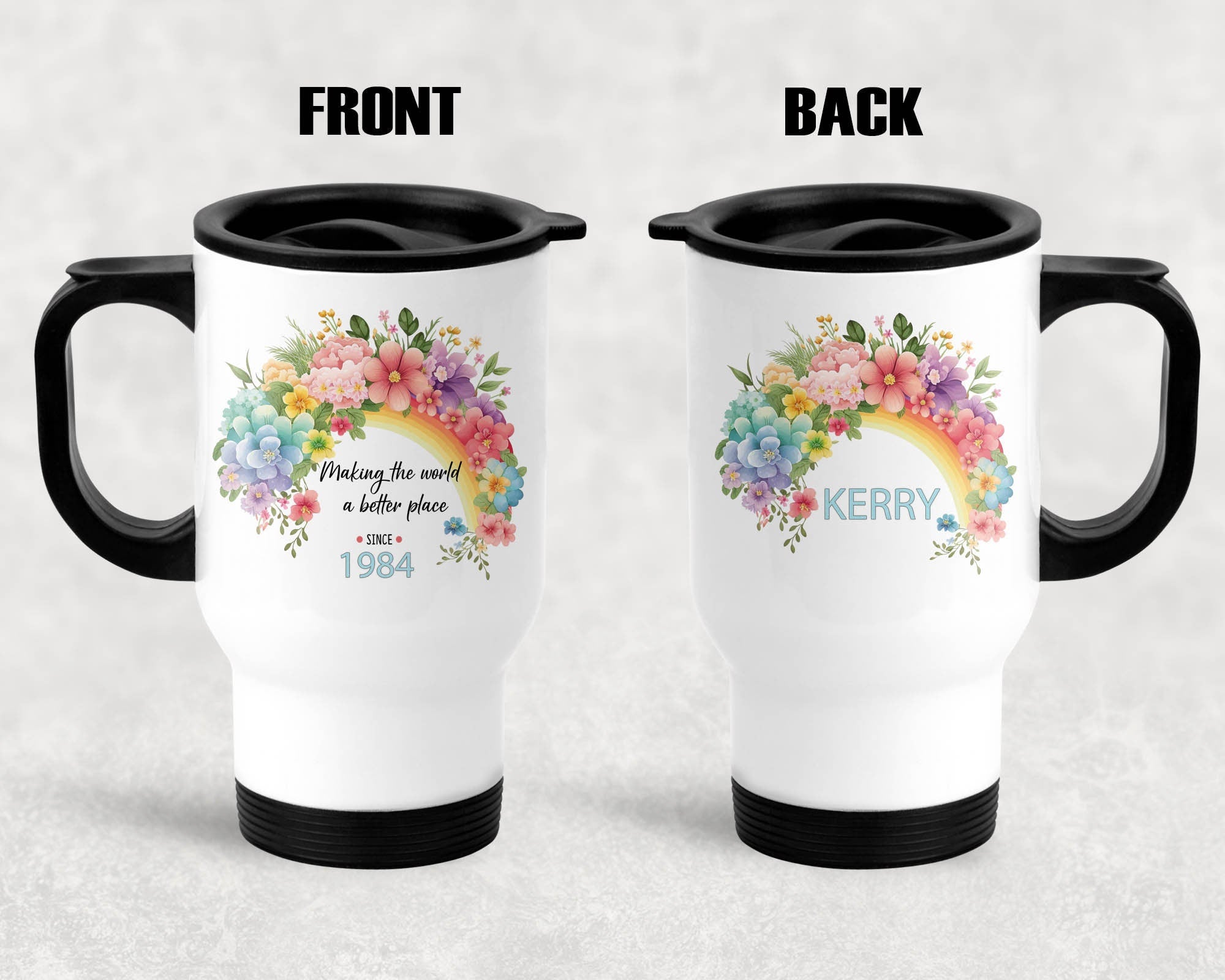 Personalise this beautiful travel mug with a name and year of birth to accompany the lovely quote "Making the world a better place since" (year). The main quote is printed on the front of the mug, along with the selected year of birth and the rainbow with a name will be printed on the back. The 14 oz insulated travel mug is ideal for keeping drinks or soup warm and features a pretty floral rainbow on both sides.