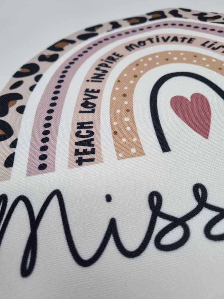 A beautiful rainbow design with the words Teach, Love, Inspire, Motivate, Listen and Encourage inside.