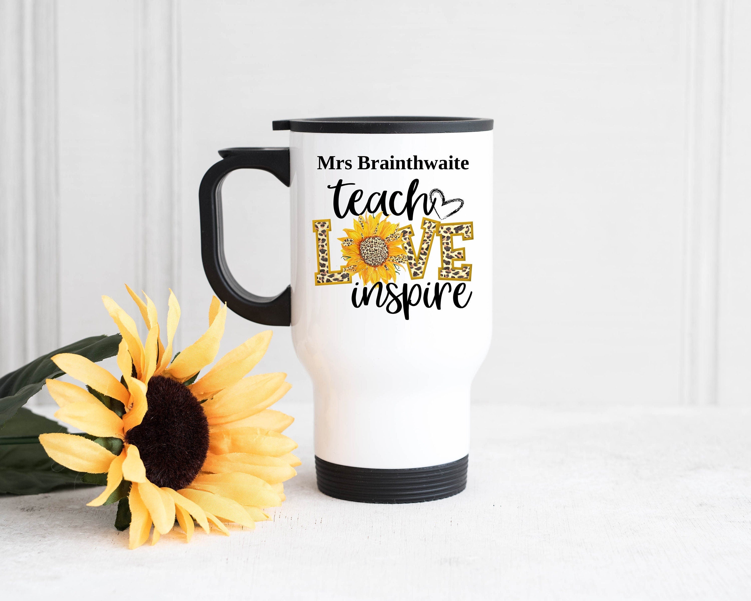 The perfect way to keep your coffee/tea/soup warm or to give a special teacher to say thank you at the end of term or a leaving gift! One of our most popular items printed with the words 'Teach, Love, Inspire.