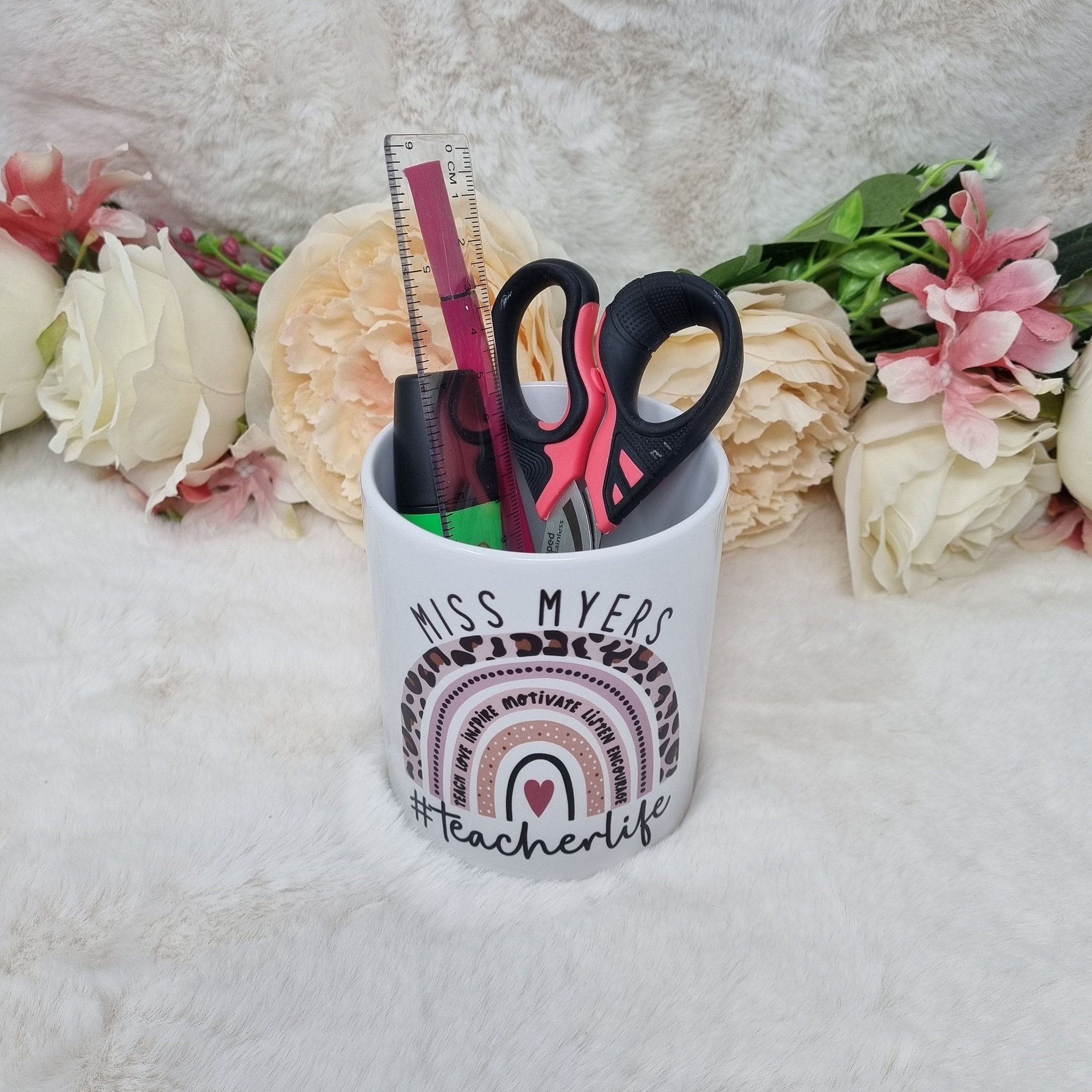 A beautiful and unique personalised printed ceramic pen pot desk organiser , ideal for teachers desk to hold pens/pencils etc or just a general desktop organiser.